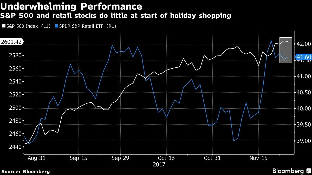 這是否是一個在強勁的股票上漲後“買傳聞、賣新聞”的案例,或者只是銷售 未能達到降低的預期,股票幾乎沒有任何表現的事實讓人有些擔憂。這是因為這表明公司和經濟正處於一個需要超越預期,而不僅僅是滿足預測的階段,以證明高估值的合理性。SPDR標準普爾零售ETF與11月23日相比基本持平,那天是美國感恩節假期前一天,儘管彭博情報報告稱,黑色星期五週末購物中心的店鋪訪問量顯示出比往年更多的流量,越來越多的消費者在購物而不僅僅是瀏覽。