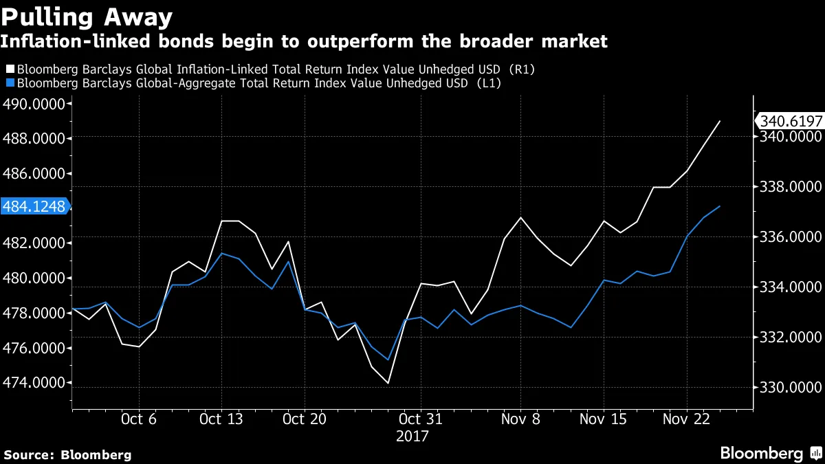 債券有一個令人驚訝的領頭羊儘管缺乏通貨膨脹,但保護投資者免受更快通貨膨脹影響的債券表現良好。彭博巴克萊全球通脹掛鈎指數本月上漲了1.94%,在19個主要指數中表現最佳,超過了基準彭博巴克萊全球綜合指數的1.33%漲幅。彭博新聞的塞巴斯蒂安·博伊德報道,銀行數據表明,截至11月21日的一週是國債通脹保護證券流入的第三大周。可能還有時間進入市場。博伊德報道,T. Rowe Price的投資組合經理史蒂夫·霍伯和斯蒂芬·巴託利尼表示,如果消費者物價指數在明年因美元疲軟和勞動力市場緊張而回歸趨勢,TIPS尚未反映出更快通貨膨脹的潛力。至少,所謂的掛鈎債券的表現可能有助於支持對美國收益率曲線收窄的一個解釋,即短期和長期債券利率之間的差距。收益率曲線狹窄通常與經濟放緩的臨近相關,這往往會抑制通貨膨脹並有利於長期債券收益率。但由於通貨膨脹預期可能在上升,正如掛鈎債券的表現所測量的,那麼也許狹窄的收益率曲線不再是對經濟的公投,而更多是反映外國投資者抓住相對於其他發達國家提供的歷史高收益的美國債務。