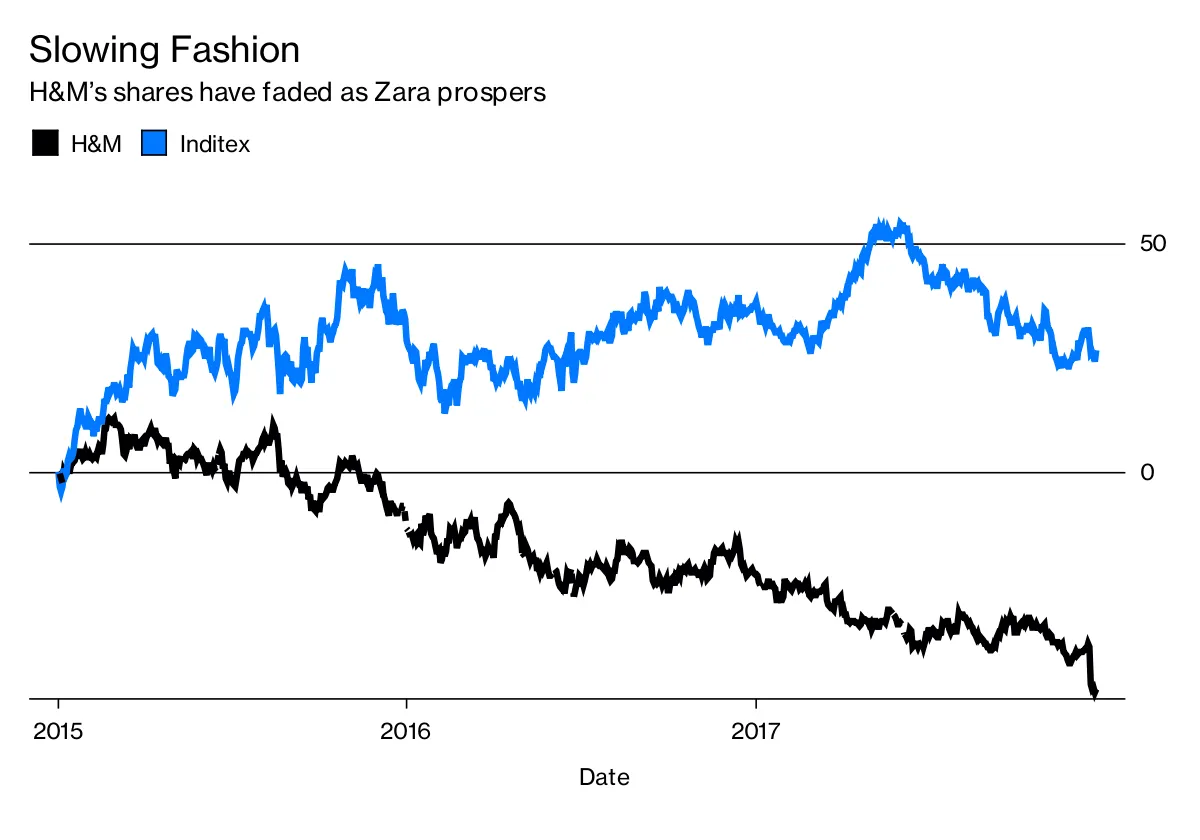 H&M成立於1947年,在1990年代迅速崛起,幾乎創造了銷售時尚、廉價服裝的商業模式,這些服裝被迅速設計、生產並送到商店。通過與名人設計師和頂級模特合作,並在全球城市張貼展示其色彩繽紛商品的廣告牌,它成長為全球最大的時尚零售商——這一稱號在2012年時仍然屬於它。但此後,它被Inditex SA超越,後者是Zara的母公司,在歐洲生產超過一半的商品,使其能夠比主要依賴亞洲供應商的H&M更快地補貨。