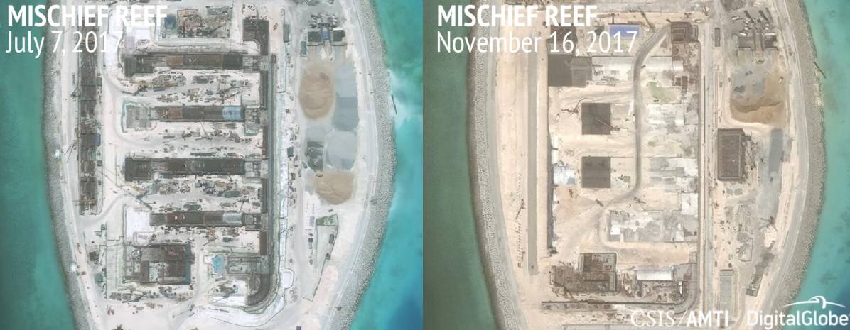 美國智庫“戰略與國際研究中心”(CSIS)旗下的“亞洲海事透明倡議”(AMTI)網站有發佈了一組中國南海島礁的判讀圖片,這期的標題是“建設的一年”。