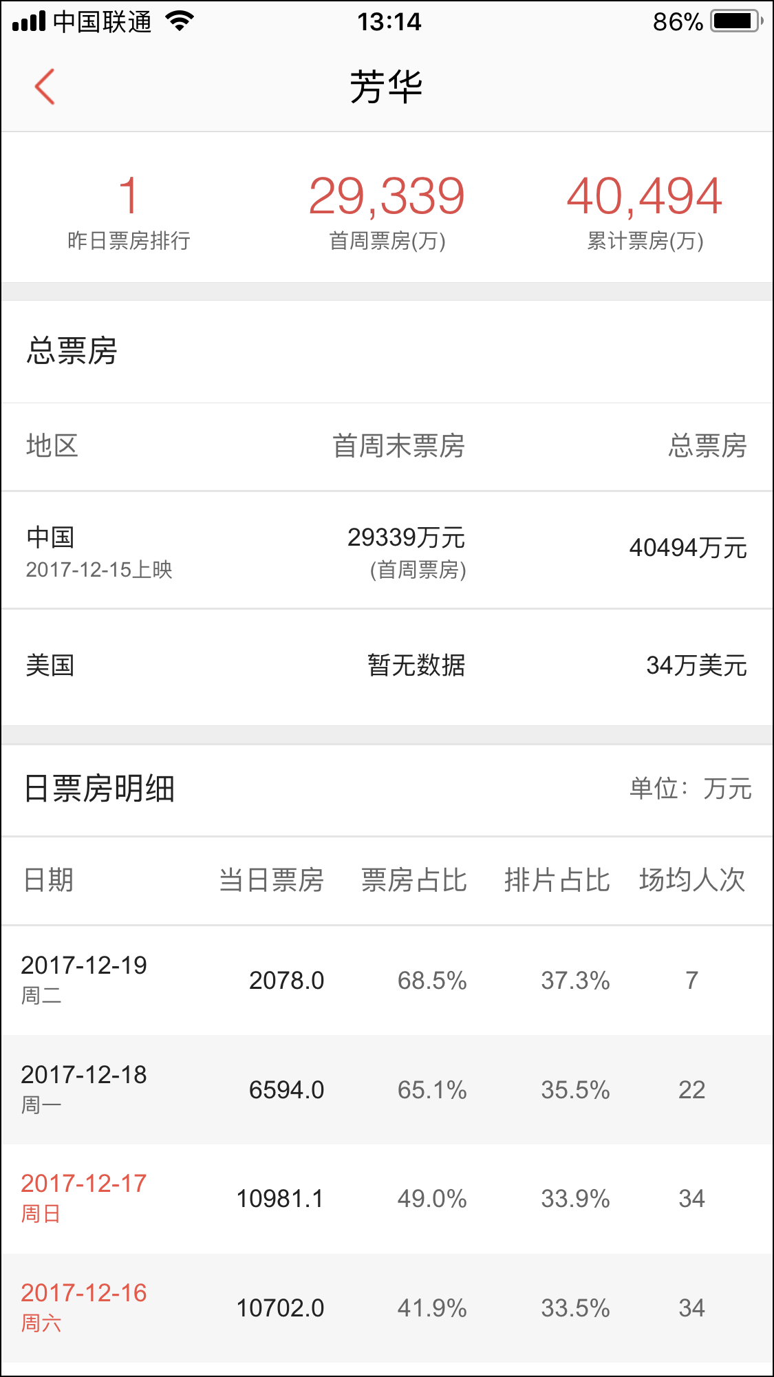 不過,二級市場方面,投資者對於《芳華》的票房預期反應平淡。截至12月18日收盤,華誼兄弟股價漲幅1.12%,收報9.05元/股。北京文化股價微跌0.56%,收報14.27元/股。單個明星、導演甚至單部電影對於公司業績產生決定性貢獻的可能性正在逐漸消失。