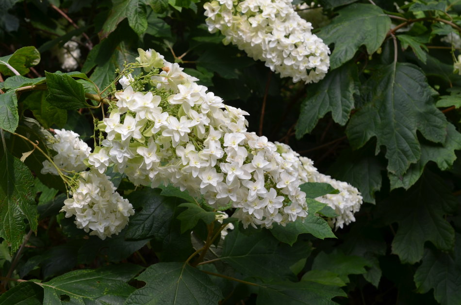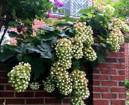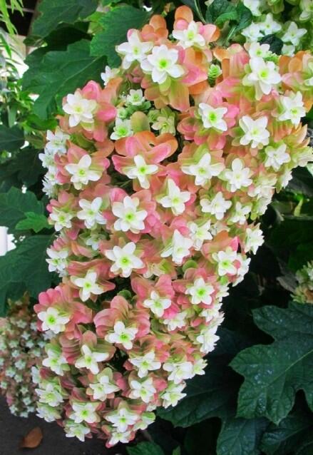 圓錐狀花序,直立,15.2~30.5釐米高,7.6~12.7釐米寬,開花初期花瓣白色,後漸轉變成粉紅色。秋冬在枝頭保持棕鏽色紙質乾燥花序。繡球花屬中只有Oakleaf hydrangea 和r peegee hydrangea (H. paniculata) 具有圓錐狀花序。花期5~7月。