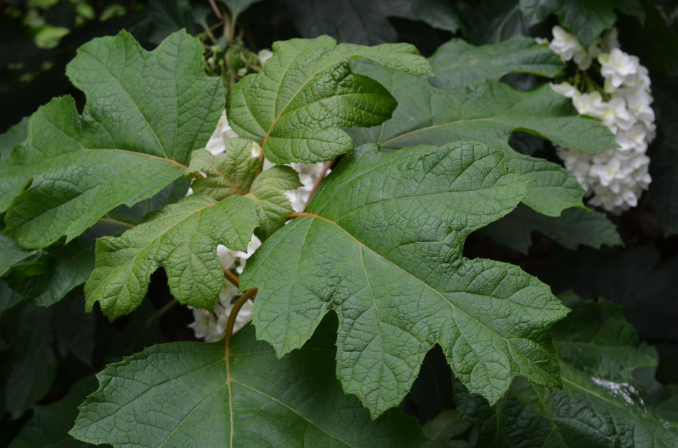 葉片寬卵形或寬卵狀圓形,10.2~30.5釐米長,長寬接近,3~7裂,葉表面黃綠色-深綠色,葉背面具白色絨毛,生長於陰處者樹葉更大。