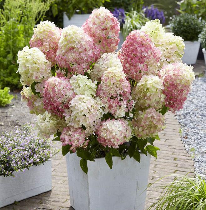 品種特點:圓錐繡球植株較高大,一般可長到1-5米,長勢強健、生長速度快,小尺度的空間需要每年進行定向修剪,否則植株會越來越巨大。修剪遵循減掉枯死枝條、剪掉內生枝、細弱枝,形成飽滿的灌木叢即可。