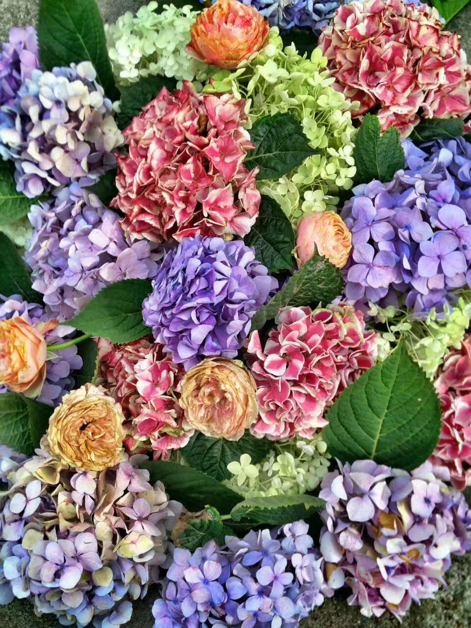 今年第一批繡球與月季,裏面綠色的是喬木繡球貝拉安娜,紫色、藍色的是大花繡球無盡夏,紅色白邊的是精靈