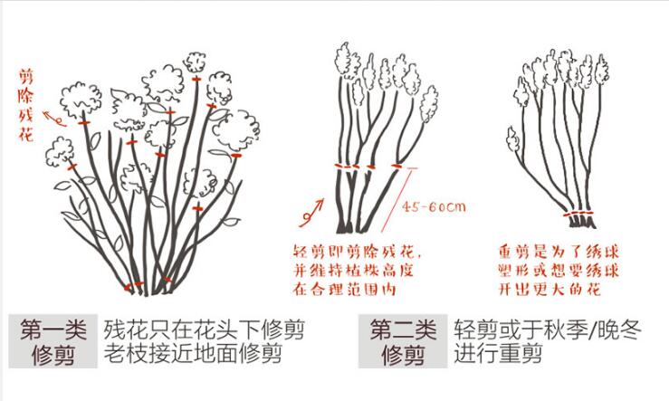花朵在新枝開放,圓錐繡球的花蕾當季形成,在開花前1-2個月分化出來,所以開花時間比在老枝上開花的繡球要晚,一般從仲夏開始持續到霜降。圓錐繡球不及時修剪並無大礙,只要避免將當季的花蕾修剪掉即可。因此,可以在花後隨時進行修剪。