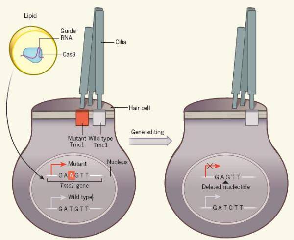 Chen和Liu團隊啓用的是熱門的CRISPR–Cas基因編輯技術。研究團隊將含有Cas9和RNA的脂滴注入新生TCM1貝多芬小鼠的內耳,這種脂滴能和細胞隨後融合。基因編輯後突變基因中腺嘌呤核苷酸A被敲除,從而使該基因失活。但同時保留了野生型基因,保證正常聽力功能實現。
