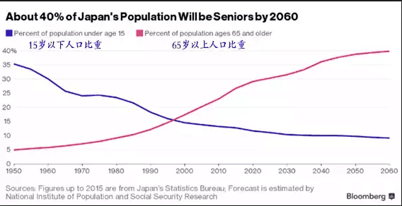 日本歷年未成年人與老年人的人口比例圖,與這種死亡交叉趨勢相伴的,是日本國財政支出的急劇增長和收入的鋭減,人口危機導致的財政危機使得日本國走向衰敗