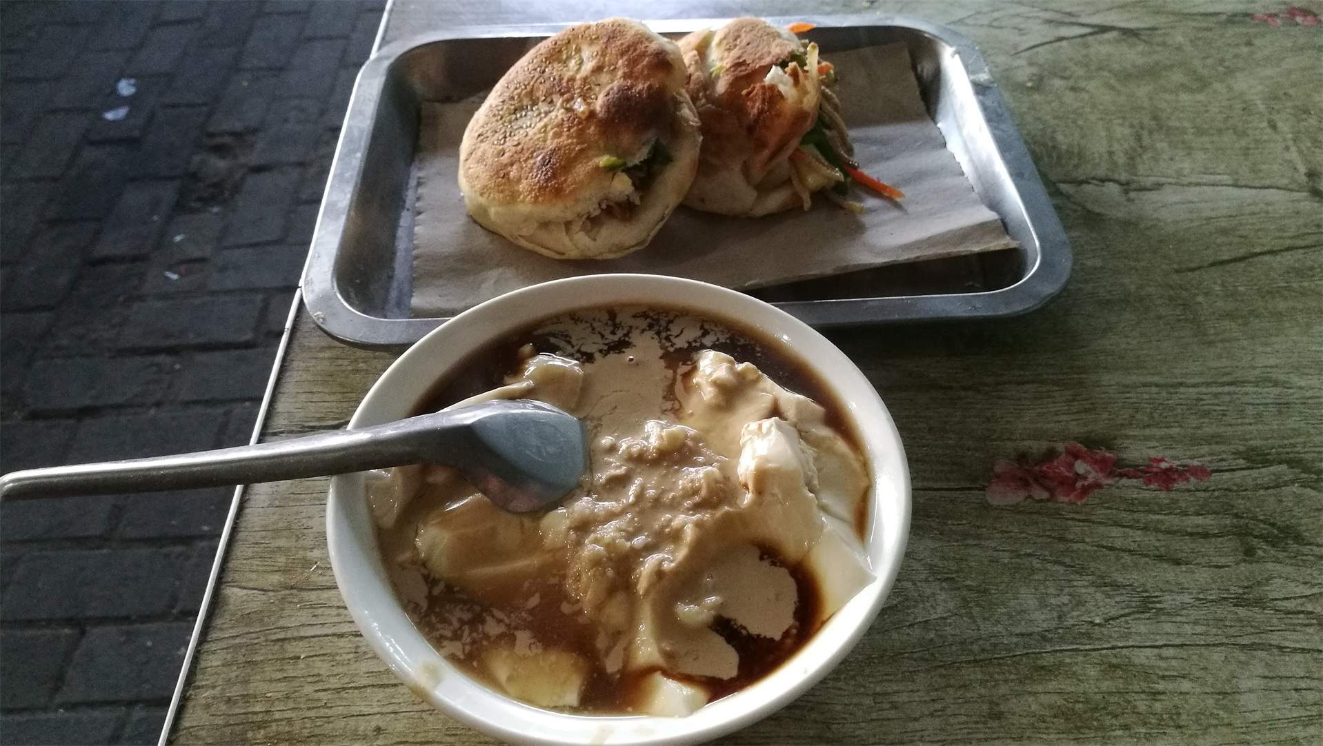當地特色小吃是驢肉火燒和老豆腐,在外地人開的店也能吃到南方人喜歡的甜豆腐腦。