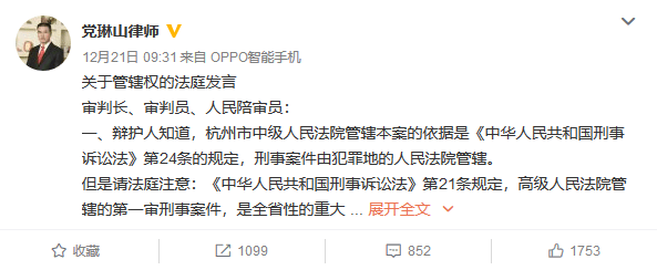 以上為黨琳山律師於12月21日上午9時發佈在微博上的言論。