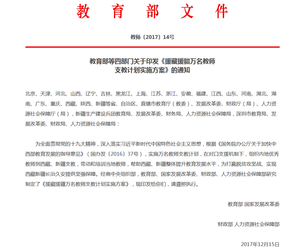 今年12月15號,教育部、國家發展改革委、財政部和人力資源社會保障部四個部門一起印發了一個援藏援疆萬名教師支教計劃實施方案,也就是説,要實施萬名教師支教計劃了。