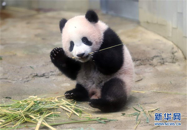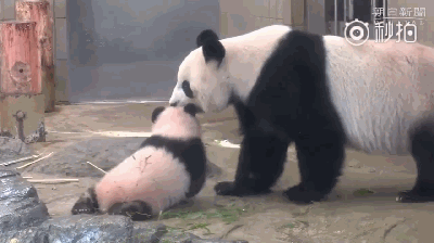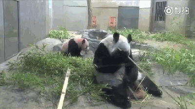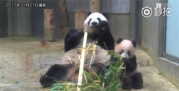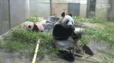 這天,真真正端坐着吃竹子,香香在她背後玩耍。