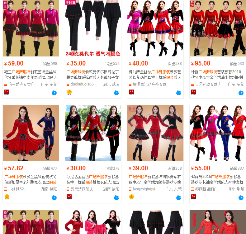 在某電商平台上輸入“廣場舞服裝”進行搜索,結果顯示多達100頁的相關服裝銷售的店鋪,它們出售的服裝價格一般在幾十元人民幣左右,一些“爆款”商品的月銷量甚至能達到上萬件。