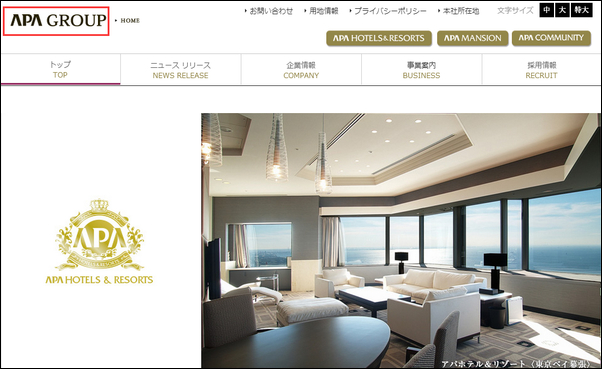 APA酒店和APA集團官網頁面雖然沒有明顯的右翼標語,但還是會在一些小角落上,加上アパ財團的項目鏈接:“勝兵塾”和募集論文;