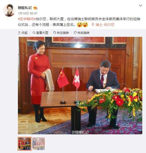 1月16日0時47分,@隨媛札記 更新了目前最後一條微博:“#簽字瞬間#伯爾尼,聯邦大廈,在出席瑞士聯邦委員會全體委員集體舉行的迎接儀式後,還有個流程:貴賓簿上簽名。”