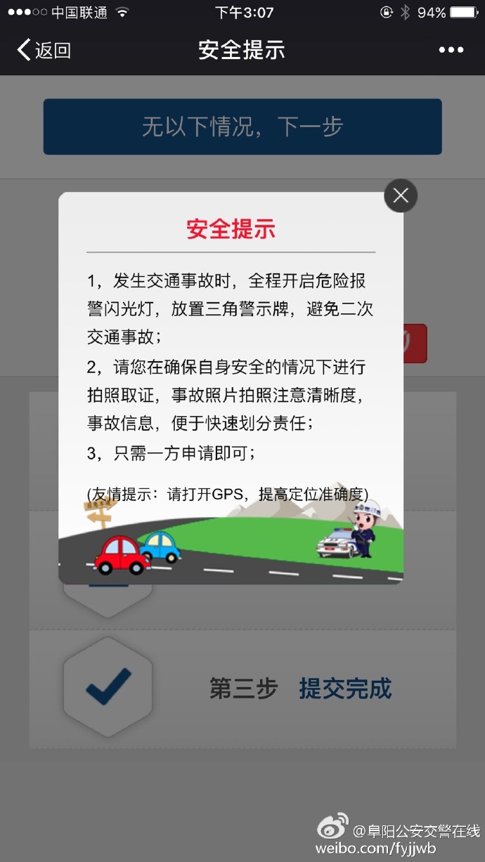 @阜陽公安交警在線 還上傳了微信快速處理輕微交通事故操作圖示。
