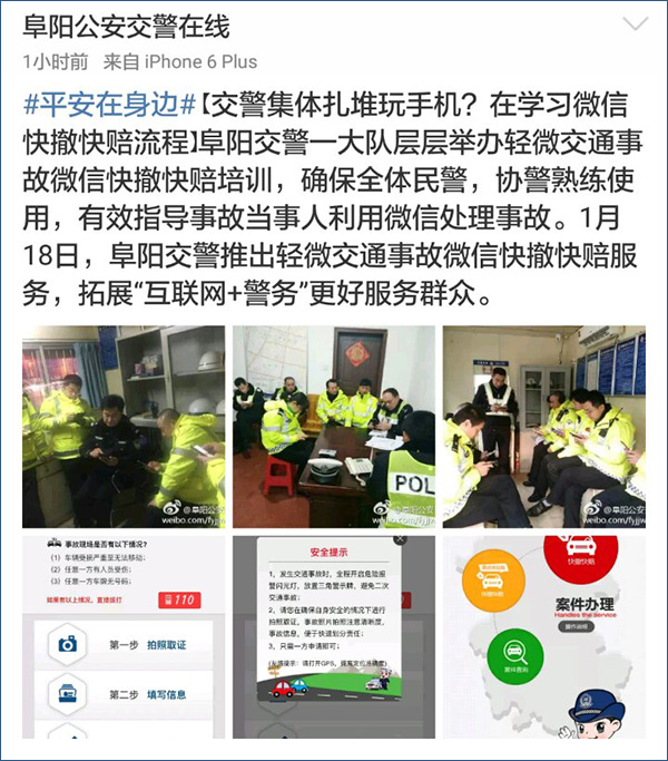 1月18日,阜陽公安機關推出了微信快速處理輕微交通事故業務,交警們利用空餘時間進行培訓,確保全體民警、協警熟練使用,有效指導事故當事人利用微信處理事故。