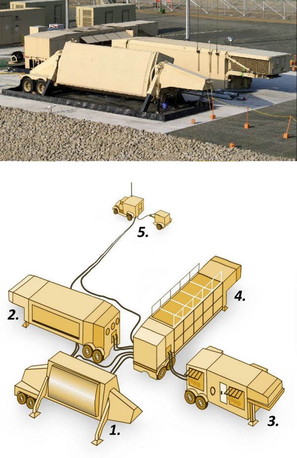 THAAD反導系統配屬的AN/TPY-2雷達配套設備示意圖,分別為相控陣雷達天線,電子設備艙,主電源單元,冷卻單元和操作控制單元