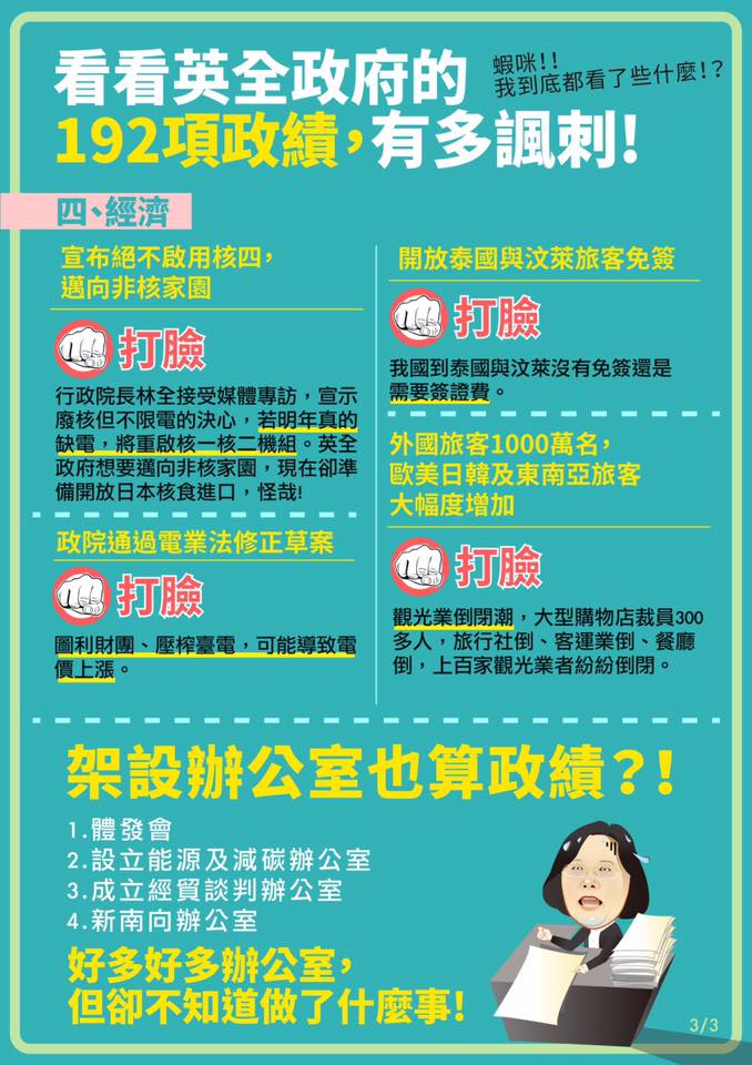蔡英文勝選一週年,選民發現被騙了,説好要建設台灣,她卻在惡化經濟環境,説好要團結人民,她卻在政黨惡鬥,説好要照顧弱勢,她卻砍了七天假,放進日本核食。