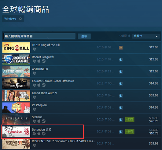 《返校》已被封為“台灣之光”,自1月12日上架,不到12小時,就進入Steam(注:全球最大的綜合性數字遊戲發行平台)暢銷榜前三(據觀察者網查詢,目前排名第8),好評率高達97%。