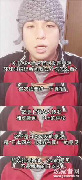 繼上次一名叫新野公介的日本留學生於微博發佈視頻表示,日本其實有很多希望中日友好的人們,APA此舉並不代表所有日本人的看法。