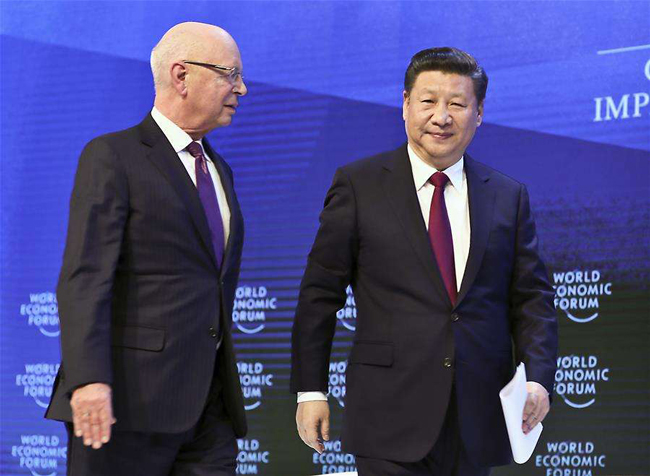 1月17日,瑞士達沃斯,聯合國發展規劃委員會副主席、達沃斯世界經濟論壇創辦人克勞斯·施瓦布與習近平主席在論壇現場(圖片來源:新華社)