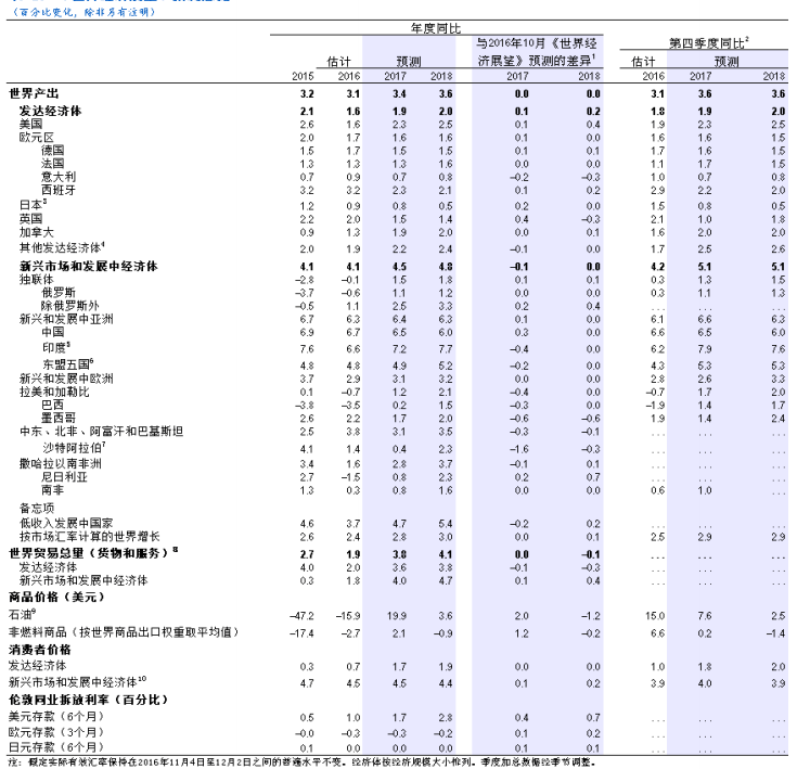 該報告還將中國2017年經濟增速預期大幅上調0.3個百分點至6.5%。報告主要作者、IMF首席經濟學家莫里·奧伯斯菲爾德在發佈會上説:“中國仍是世界經濟發展的主要驅動力。我們上調了對於中國2017年增長的預測,這也是明年全球經濟復甦預計加快的一個關鍵的支撐因素。”