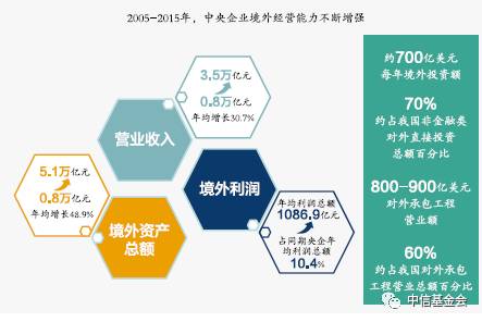 國企在“走出去”方面發展很快。2005-2015 年,中央企業境外經營能力不斷增強。每年境外投資額約700 億美元,約佔我國非金融類的對外直接投資總額的70%。對外承包工程營業額800 多億美元,約佔我國對外承包工程營業總額的60%。中央企業境外營業收入年均增長37%。10 年期間,資產總額年均增長48.9%,利潤總額年均增長10.4%。