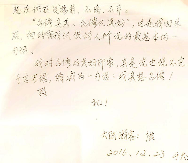 而這封大連旅客在去年12月寫給“觀光局”的信,對所有為台灣觀光努力的人來説,特別暖心。這名遊客在信中説,想表揚自己遇到的導遊,他活潑、客氣、再三提醒遊客注意安全又知識淵博,“我對台灣的美好印象,真是説也説不完,千言萬語,縮減為一句話:我真想台灣!”