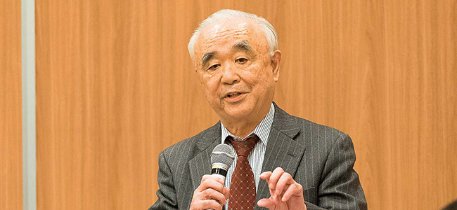 日本“向世界傳遞史實”協會代理會長茂木弘道,正在本月19日的例會上發言(勝兵塾網站 圖)