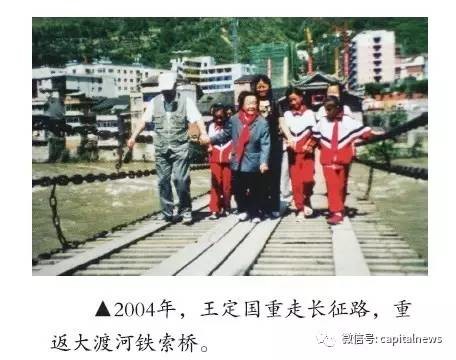 2004年,王定國重走長征路。在四川省天全縣紅軍烈士陵園,兒女僱了頂滑竿要抬她上山,她堅定地大聲説:“我是紅軍,我自己能上去!”在大渡河邊,面對湍急的河水和搖晃的鐵索橋,王定國推開上前攙扶的人,隻身在一百多米的橋上走了個來回。