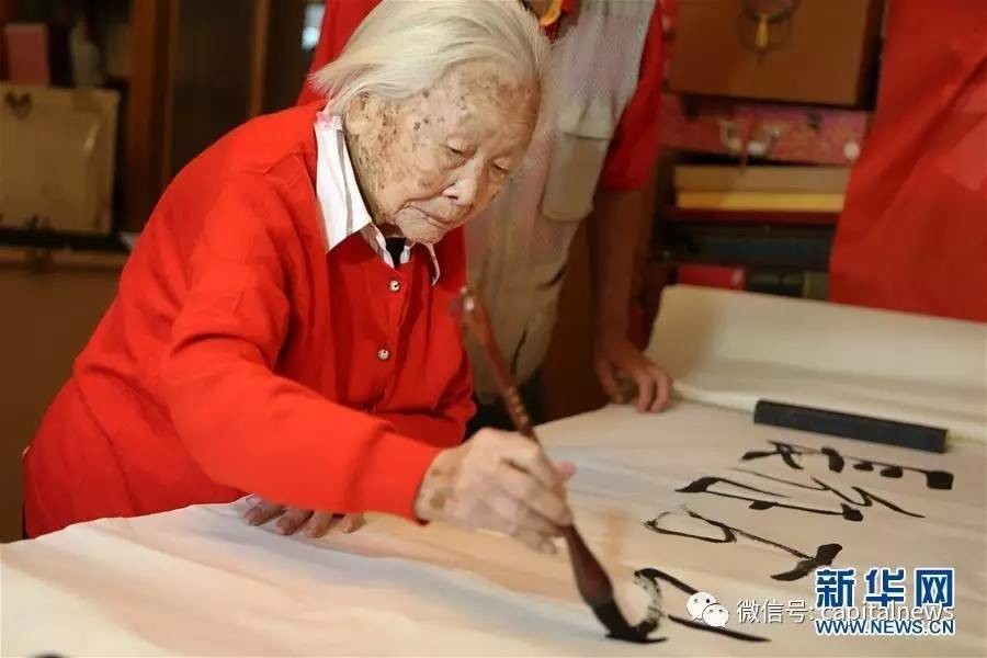 去年,新華社記者曾採訪王定國。她提筆,蘸墨,俯身,深吸一口氣,揮動手臂一氣呵成,四個大字躍然紙上——“長征萬歲”。