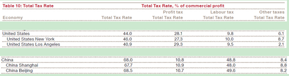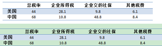 我眼神不太好,但是我也看出來了,中美之間比較,企業所得税的比例,中國比美國低得多,其他税費的比例,中美之間差不多。這些税加起來,中國比例只有利潤的19%,比美國34%的比例低的多。