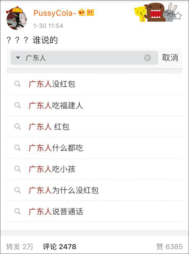昨日(30日),網友@PussyCola- 驚奇地發現,微博搜索榜上,竟然出現了關鍵詞“廣東人沒紅包”,誰説的,難道廣東人的紅包被年獸吃了?