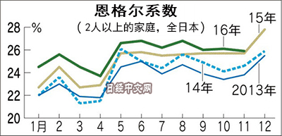 日本總務省的家庭收支調查(2人以上家庭)顯示,2016年1~11月的恩格爾係數平均值為25.7%,2015年全年為25.0%。由於每年12月食品支出的比重都會升高,2016年全年的平均值將進一步升高,有可能超過26%。