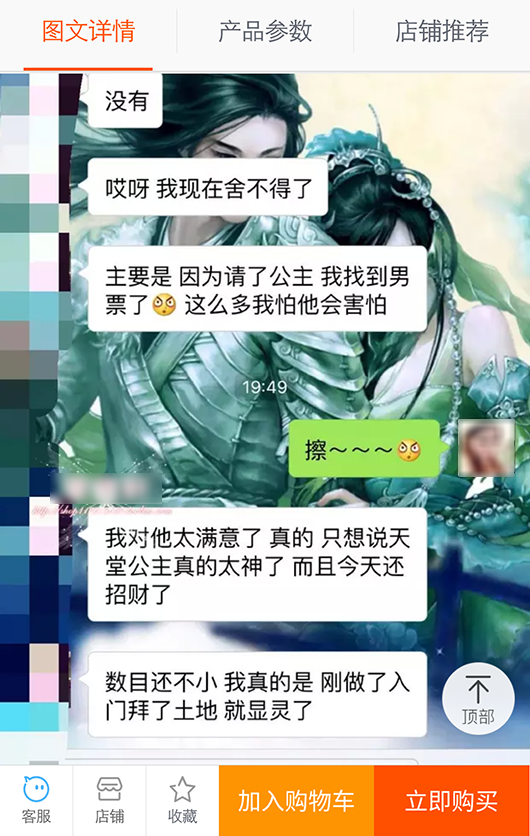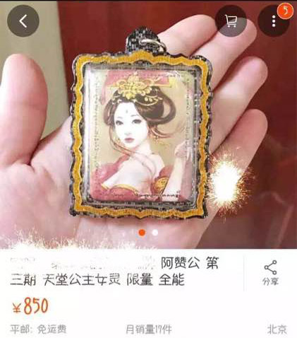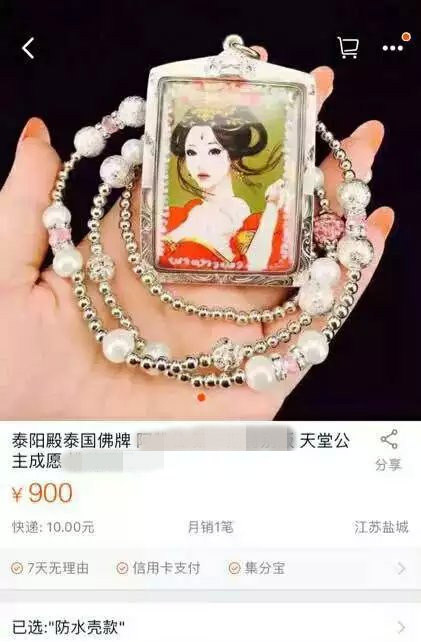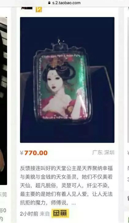 淘寶、閒魚等網購平台都有所謂“天堂公主佛牌”在售,商品介紹類似於“限量、全能”、“天堂公主是天界聚納幸福與美貌與金錢的天女聖靈”……