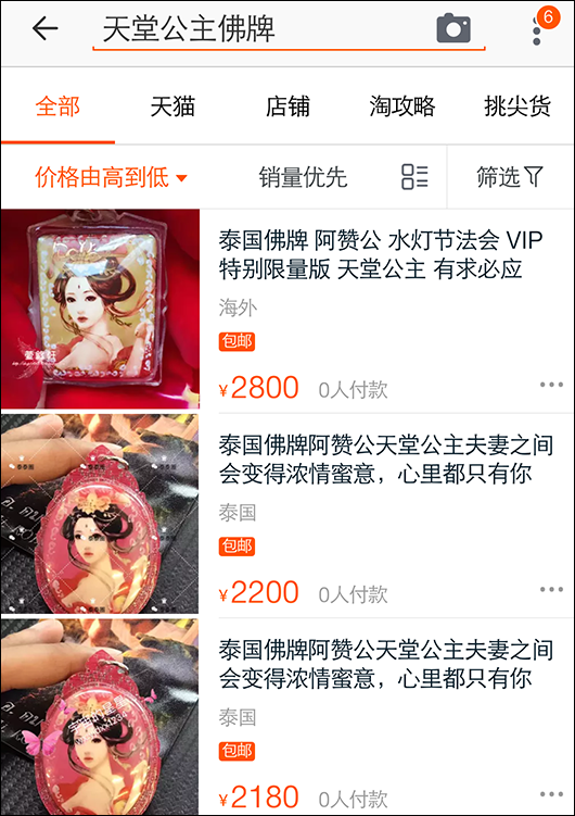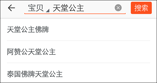 不愧是我寶!觀察者網小編在搜索框輸入“天堂公主”立馬就有“天堂公主佛牌”、“阿贊公天堂公主”等立馬跳出。
