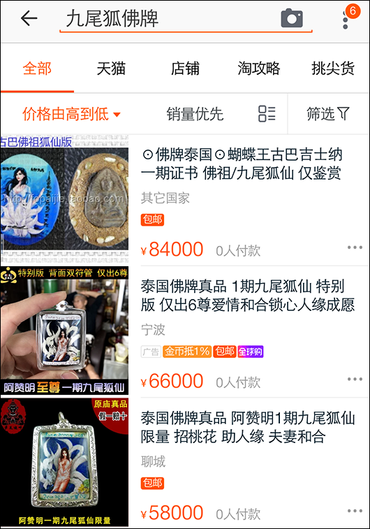 觀察者網小編又查了查, 這種“九尾狐佛牌”價格高到天際,最高售價84000元。