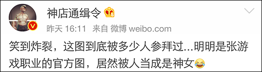 2月14日,微博博主@神店通緝令 也哭笑不得:“這明明是張遊戲職業的官方圖啊,居然被當成神女。”