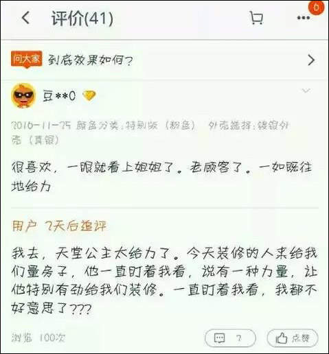 一位淘寶買家入手7天后追評:今天裝修的人來給我們量房子,他一直盯着我看,説有一種力量,讓他特別有勁給我們裝修。