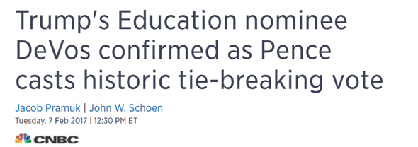 特朗普內閣雖然面臨很多民主黨參議員的激烈反對,目前為止還算是有驚無險。比如説,教育部長貝絲·達沃斯在參議院投票中獲得了史無前例的50-50,其中有兩個共和黨參議員跨越黨派界限公開反對教育部長的提名。對於這樣的僵局,副總統在參議院歷史上第一次加入投票人行列。由於彭斯副總統的支持,教育部長提名涉險過關。