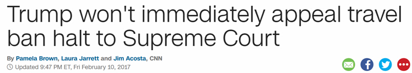 精明的特朗普政府當然不會鑽這個圈套,他的方法是發佈新的關於移民的行政令來繞過法院的判決。新的行政令將會由新的司法部長塞申斯團隊起草,這樣,一次險些限制總統重要權力的法律訴訟就會不了了之。