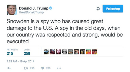 特朗普在競選前的兩年就曾經聲稱要把斯諾登要回來並繩之以法。可是,現在斯諾登回國卻並不是特朗普政府所希望看到的。原因很簡單,媒體炒作斯諾登回家完全是想把普京和特朗普建立起關係,讓人覺得普京是因為特朗普之間的特殊關係才送大禮的。