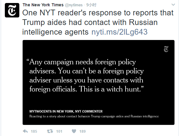 不過,幾乎在差不多時間,紐約時報Twitter轉發了一條讀者對他們文章的駁斥,“任何競選班底都需要外交政策顧問,而沒有和國外官員的聯繫就成不了外交政策顧問。這事純粹是獵巫。”