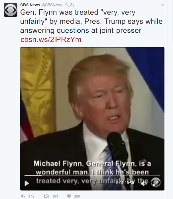 儘管“揮淚斬弗林”,但特朗普於當地時間15日上午在記者會上為弗林感到“惋惜”:”他是一個非常優秀的人,但是受到了媒體, 應該説是造謠媒體,非常不公正的待遇”,他甚至將一些媒體斥責為“謀殺行為。