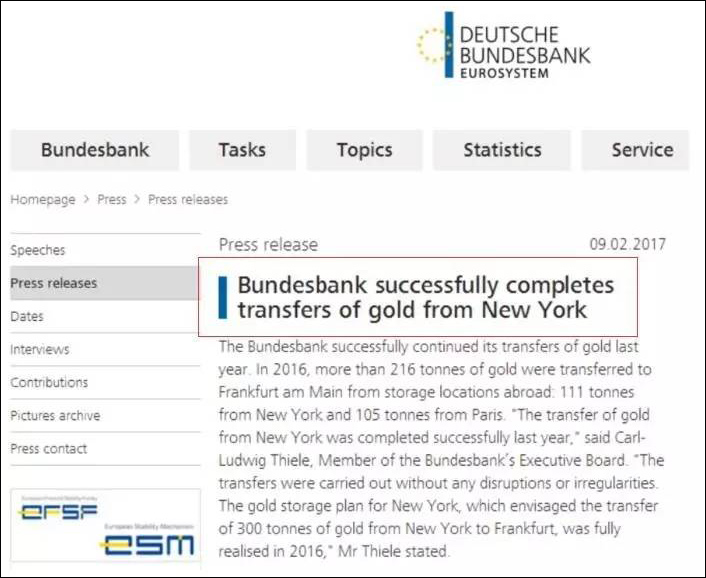 【觀察者網 綜合】上週,德意志央行在官網上發佈了一則新聞通稿,稱德國政府已成功將自己存在美國紐約和法國巴黎約583噸黃金運回國內。德國是全球黃金儲備第二大國,此次轉移數量佔其存儲近一半。如此大規模運回黃金儲備,使得德國提前3年完成了原定2020年實現的儲備目標。