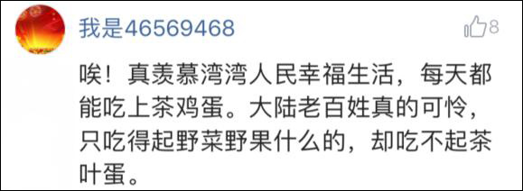 如今,大陸人對台灣的奇葩言論,已經見怪不怪。相反,大陸網友還會自嘲:是啊我們還在啃樹皮、根本吃不起茶葉蛋、吃得起的都是土豪……甚至根本就懶得解釋。