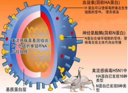 禽流感病毒基因組由8個負鏈的單鏈RNA片段組成。禽流感病毒概念中的H和N都是指病毒的糖蛋白,一種糖蛋白叫血凝素(HA),另一種叫神經氨酸酶(NA),由於這兩種糖蛋白容易發生變異,因此,根據糖蛋白變異的情況,HA分為 H1至H15十五個不同的型別,NA分為N1至N9九個不同的型別。其中,H5與H7為高致病型。研究人員發現,除了編碼血凝素和神經氨酸酶的基因之外,編碼NS1蛋白質的基因也變異頻繁。在不同的流感病毒中,編碼這三種蛋白質的基因序列變異最大,這表明它們決定了病毒的致病性。