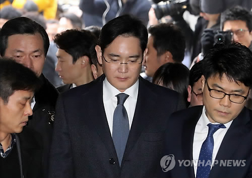 2月16日,三星電子副會長李在鎔(中)前往法院受審