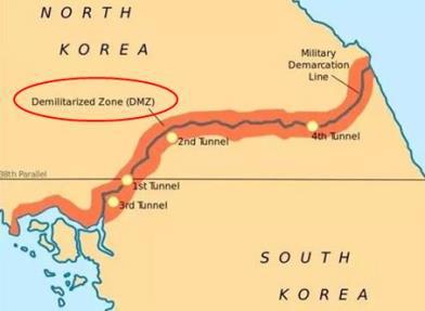這裏要特別説明一下,在韓國是沒有所謂“三八線”的説法的。照朝鮮停戰協定,聯合國軍和朝鮮以休戰為前提設定軍事分界線,即北緯38度線,並以這條線為基準,南北各撤退2公里的長約248公里的區域,被稱為DMZ(De-Militarized zone),非軍事武裝地帶。因此DMZ就是通常意義上的三八線。